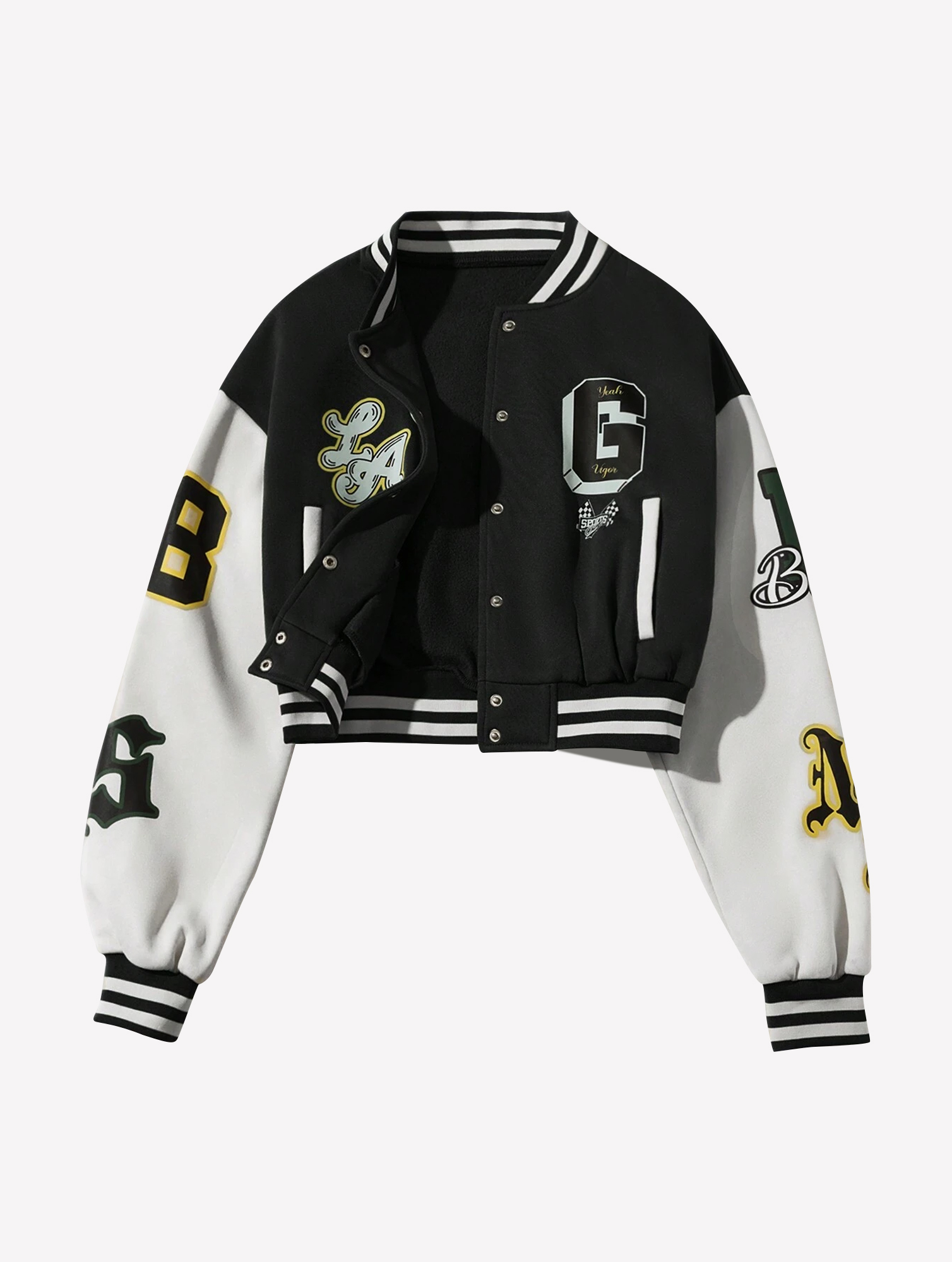 Size Guide• Cropped varsity jacket with colorblock, letter, striped, and plant print details